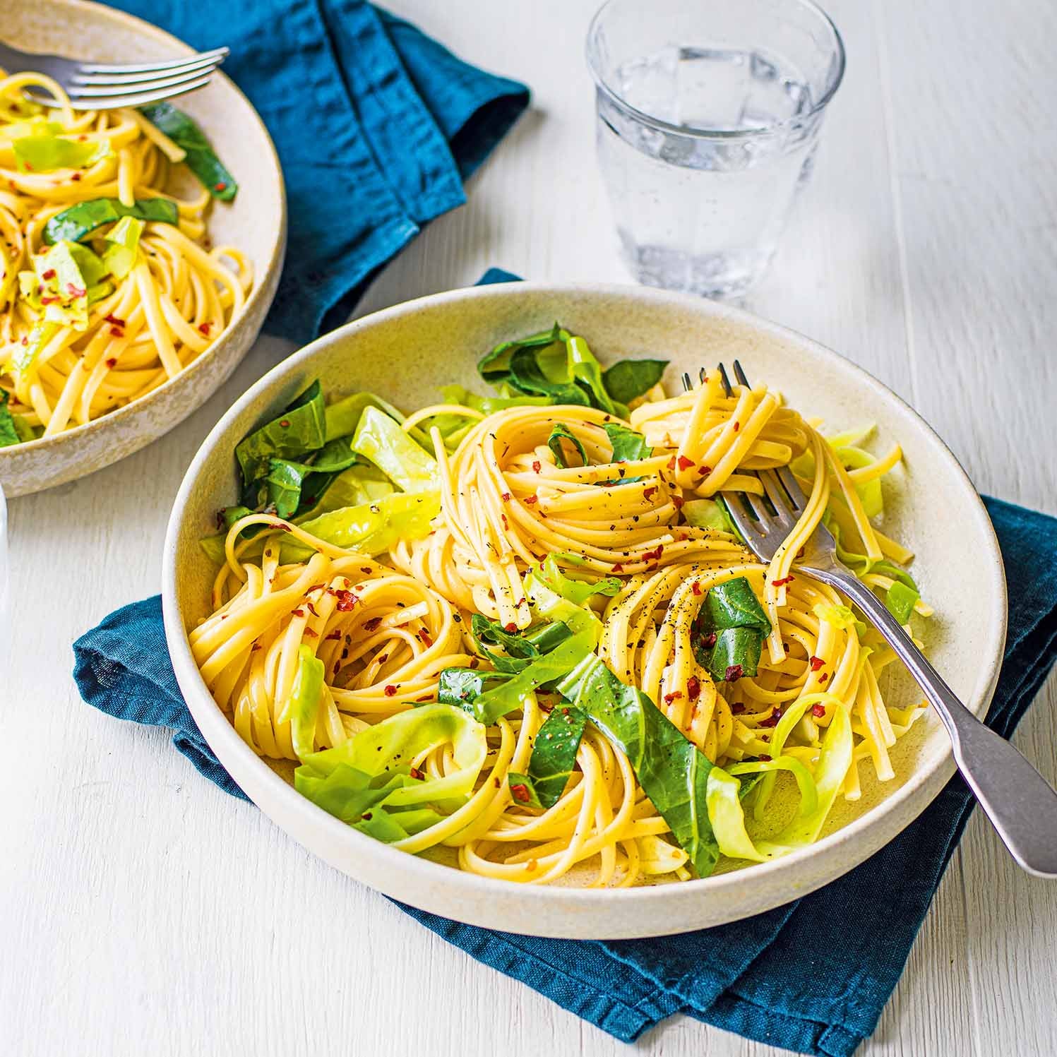 Add the pasta, tossing well to combine. Add a little more pasta water, if necessary, to create a silky sauce. Divide between 4 shallow bowls, sprinkle with the chilli flakes and add a crack of black pepper to serve.
