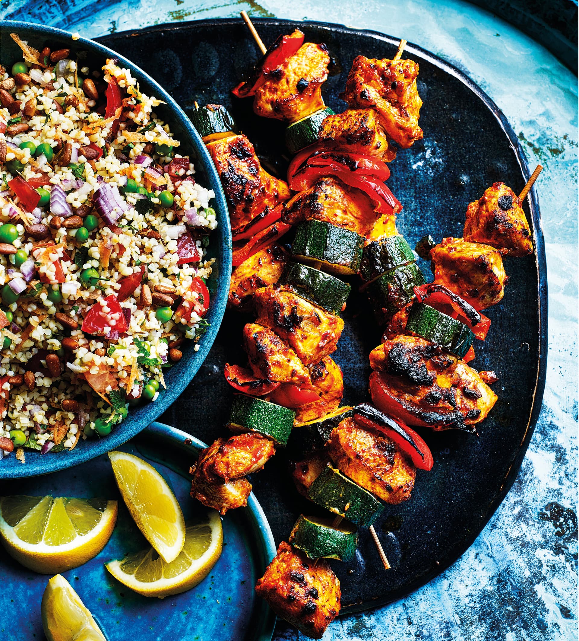 These healthier kebabs are served with a fresh-tasting bulgur wheat salad, flavoured with toasted cumin.