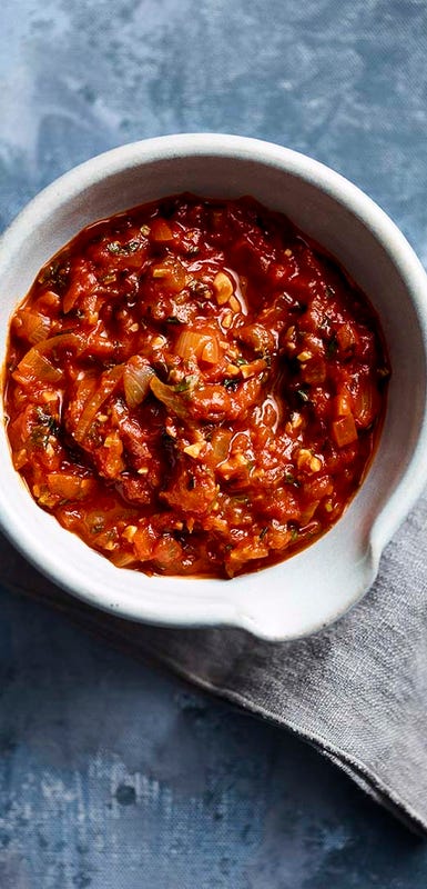 This is a fat-free tomato-based hot pepper sauce that’s great for dipping, but you can also ladle spoonful's generously over any protein. Depending on how spicy you like your hot sauce, adjust the amount of chillies accordingly.