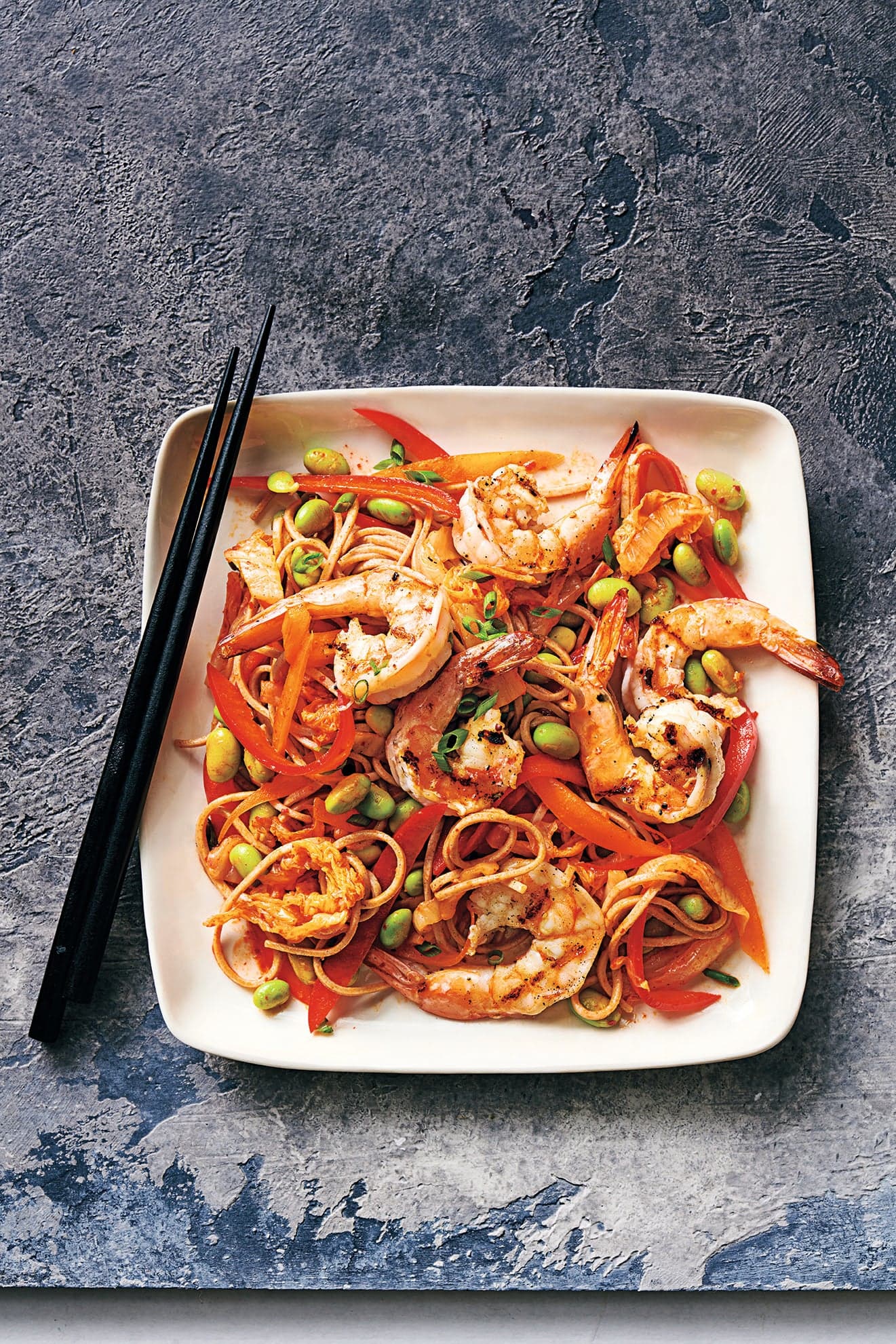 Cook the noodles in a pan of boiling water to pack instructions. Drain, then rinse and drain again. Meanwhile, in a separate pan, cook the edamame for 4-5 minutes until tender.