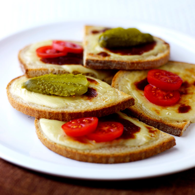 Reheat the grill until glowing and toast the cheese slices until browned and bubbling. Served warm topped with slices of gherkins or tomatoes.