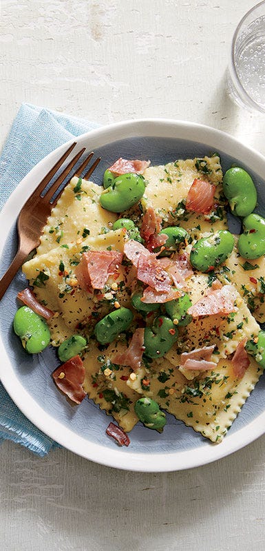 Fava beans. To shell and peel them, split open the pods and remove the beans. Cook in boiling water 30 seconds, drain, and rinse under cold water. Squeeze each bean to remove the skin.