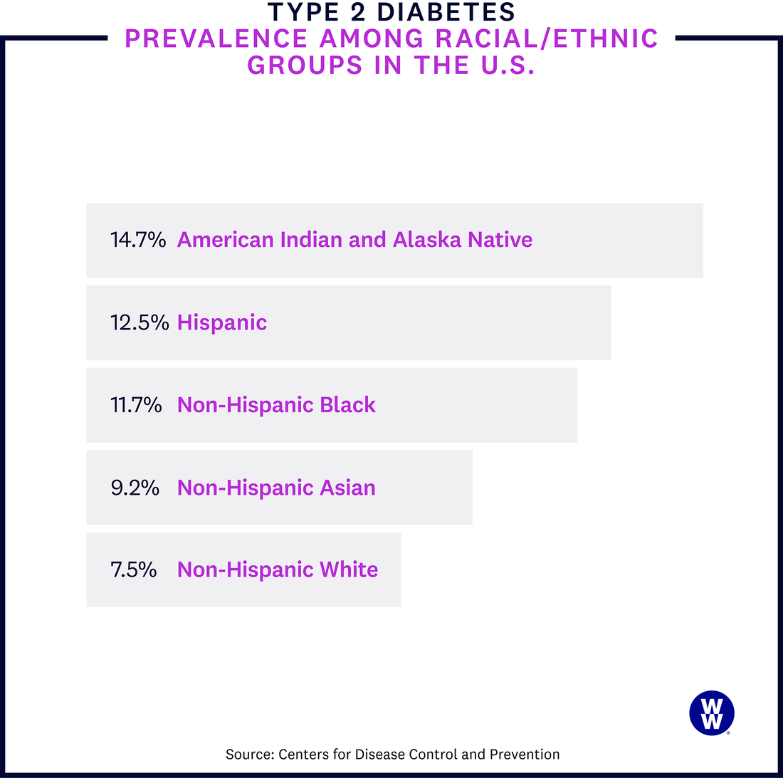 Unfortunately, yes. T2D tends to develop at an earlier age in many minority populations, and it’s often less treated, which can lead to other issues. “Complications like kidney disease are more common in racial and ethnic minority patients with diabetes,” Donner says. Why? Because it’s harder to get the right care. Screenings for complications are performed less frequently, due to lower rates of health care coverage and also less support from the health care system, including facing medical racism. When it comes to the prevention and diagnosis of diabetes, white patients receive more access and a higher quality of care than any and all minority groups, according to the National Healthcare Quality and Disparities Report by the U.S. Department of Health and Human Services.