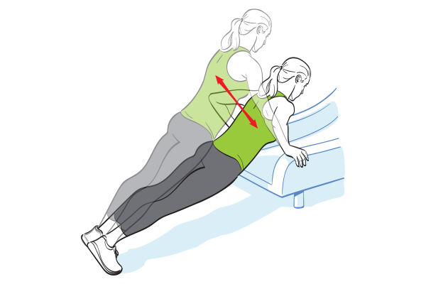 Go:Bend elbows, lowering chest toward the slide, then push up to the starting position to complete 1 rep. Do 12 to 16 reps.