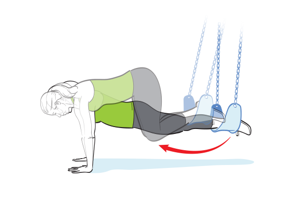 Get ready:Get in a push-up position, with the tops of your feet on a swing, and your hands shoulder-width apart on the ground.