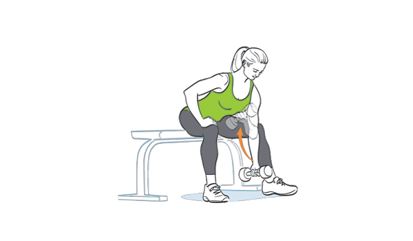 • Hold a weight in your left hand and sit on the edge of a chair or bench.