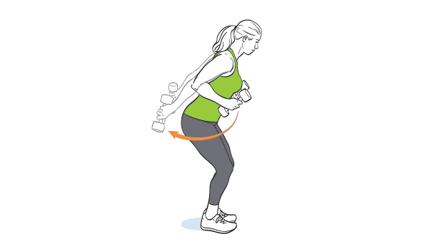 • Stand with feet hip-width apart, knees slightly bent, holding a weight in each hand.
