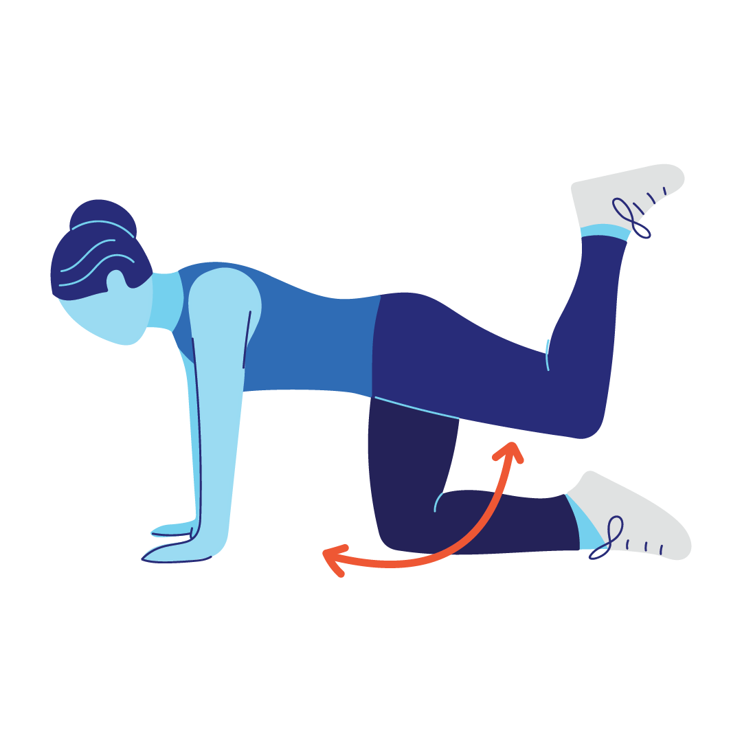 How to do it:Start on your hands and knees, with your wrists beneath your shoulders. Make sure your back is neutral, and your abdominal muscles are engaged. Keeping your right knee bent at 90 degrees, lift it out to the side until you reach hips height. Return to your starting position to complete one rep.Perform two to three sets of 10 to 12 reps per leg.
