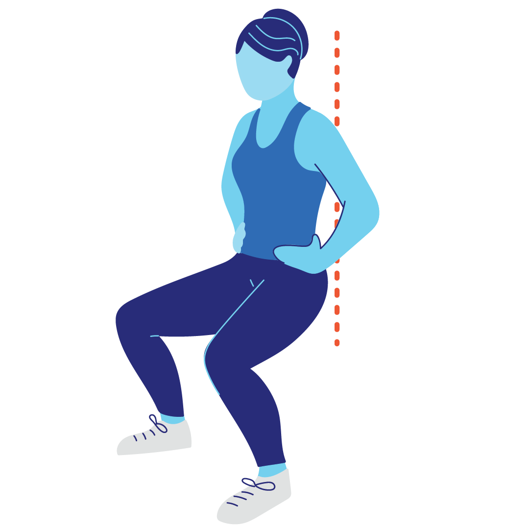 How to do it:Stand in front of the chair as though you’re about to sit down, feet hips-width apart. Keep tummy tight as you bend your knees, keeping them behind the toes. Just before your butt graces the seat, engage your butt and thighs to return to standing.Do this for two sets,10 to 15 reps per set.