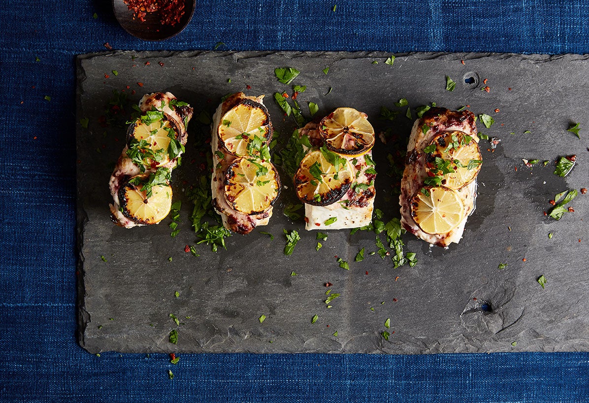 Oven-roasted halibut with charred lemon and rosemary-olive aioli