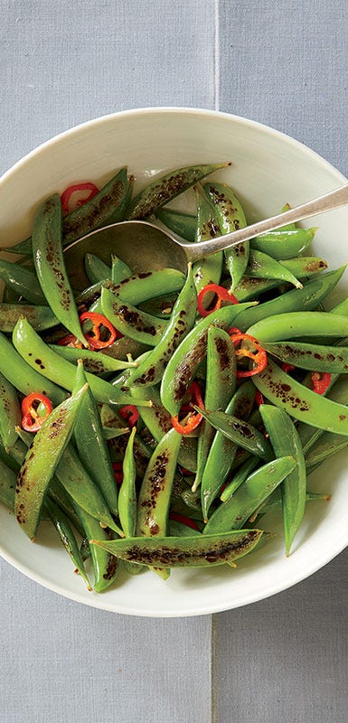 Sugar snap peas are available year-round, but look for them in farmers’ markets starting in April, when they’re at their best. Avoid pods with dark specks, discoloration, or soft spots—all signs of age. Store them unwashed in a perforated plastic bag in your crisper drawer for three to five days.