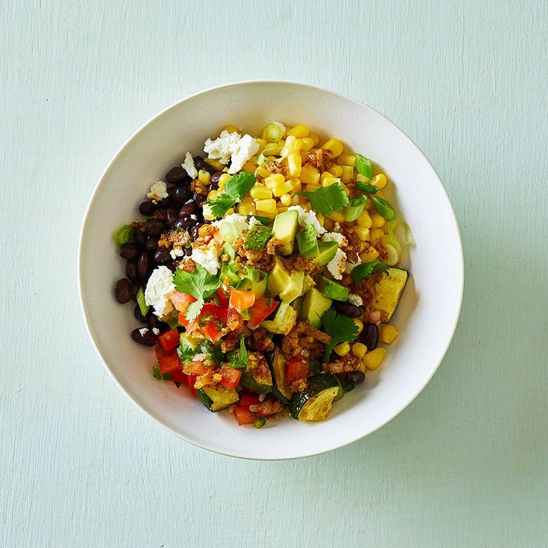 Mexican black bean, zucchini, and corn bowl with cumin-lime drizzle