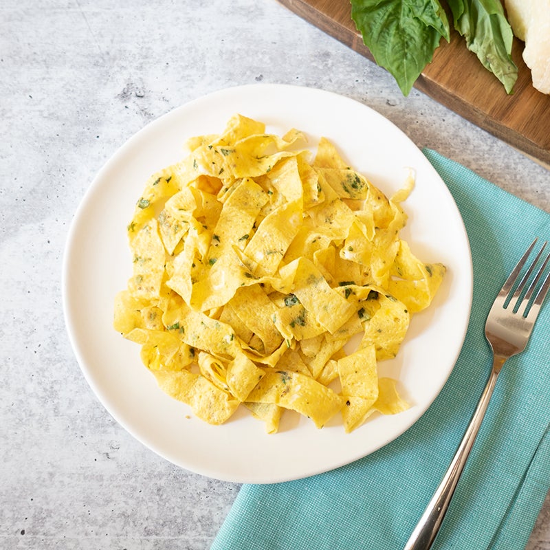 Cook up a stack of really thin omelets and slice them into strips to make wheatless noodles.