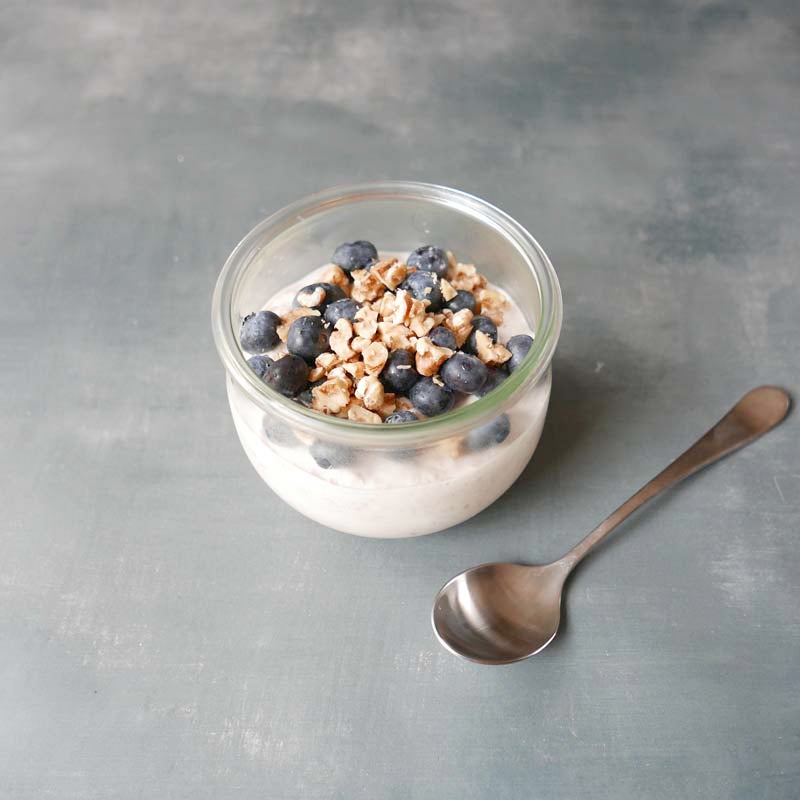 Combine uncooked oats, plain non-fat Greek yogurt, and pumpkin or banana purée in a jar and let it set overnight.