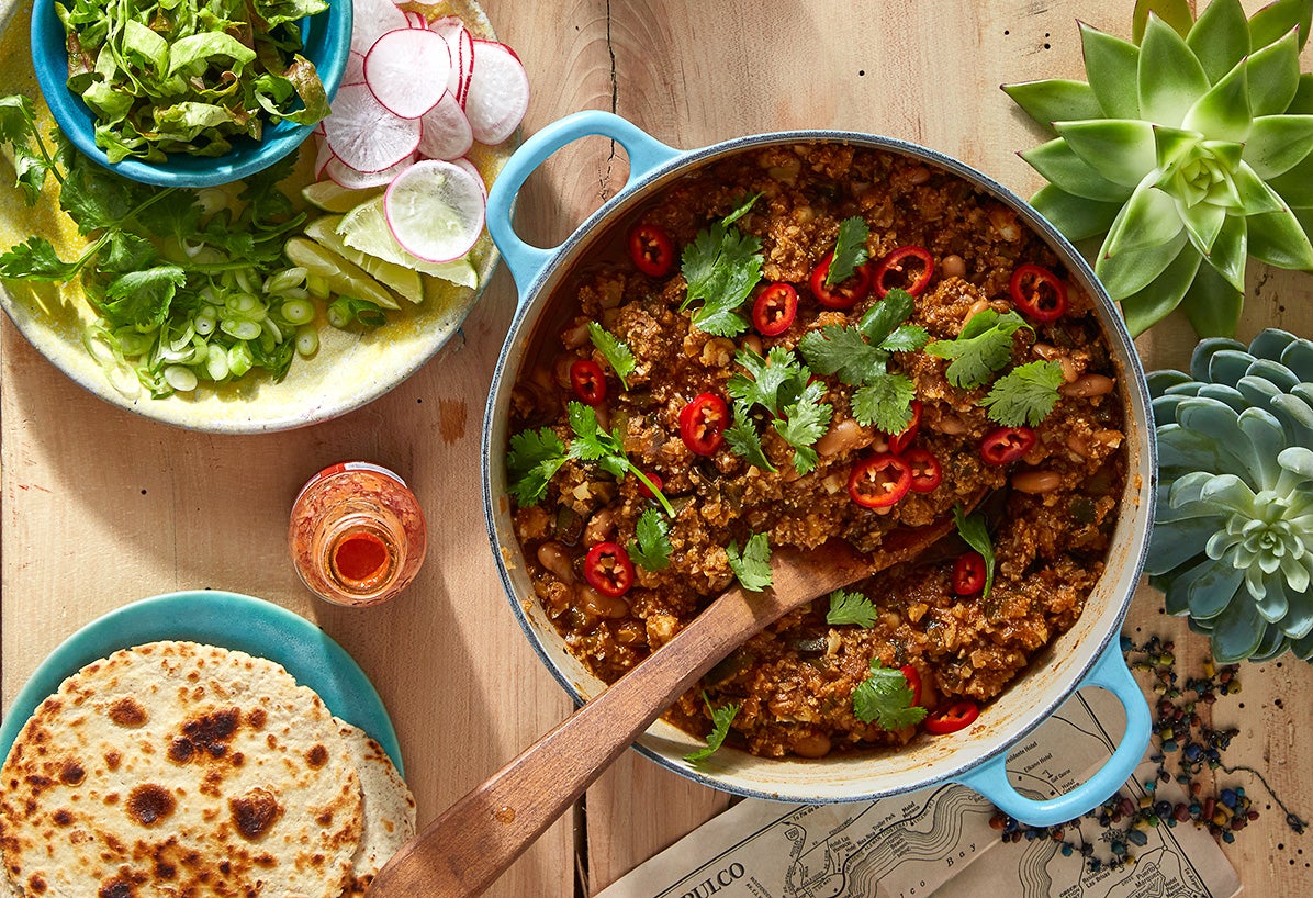 Cauliflower, white bean, and hominy chili