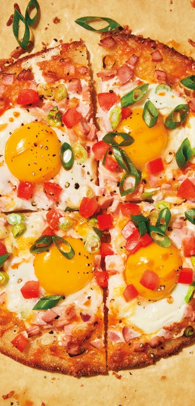 Here's an adaptable omelet recipe that serves four or five: Preheat oven to 375°F and lightly coat the sheet pan with nonstick cooking spray. Whisk together 10 eggs, about 1 cup of milk, and a few good pinches of salt and black pepper. Carefully pour the mixture onto your prepared sheet pan and sprinkle with whatever raw, chopped veggies you like. Bake for 25 to 30 minutes, or until set. Remove from oven and top with thinly sliced scallion greens and shredded cheese of your choice. Cut into squares and serve to everyone, yourself included!