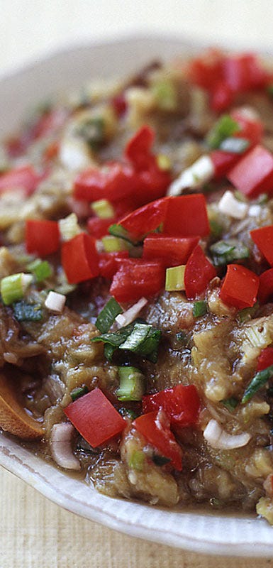 When buying this rich meaty vegetable, look for eggplants with smooth, shiny skin whose color is uniform. Their weight should be heavy for their size. For a sweeter, less bitter eggplant, choose smaller eggplants with thin skin. Ripe eggplants will not have much give when pushed with your finger—it should be firm but not hard.