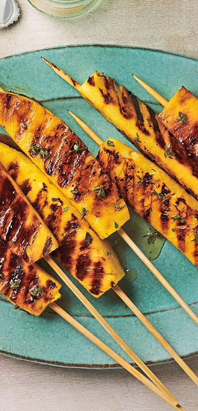Large pieces of fruit—such as pineapple rings, halved peaches, and halved bananas in their skins—are fine to just toss on the grate. Smaller chunks that could fall through, such as mango cubes or strawberries, are best grilled on skewers. Whatever fruit you’re grilling, just be sure the grate is clean. You wouldn’t want your bananas to taste like burgers!