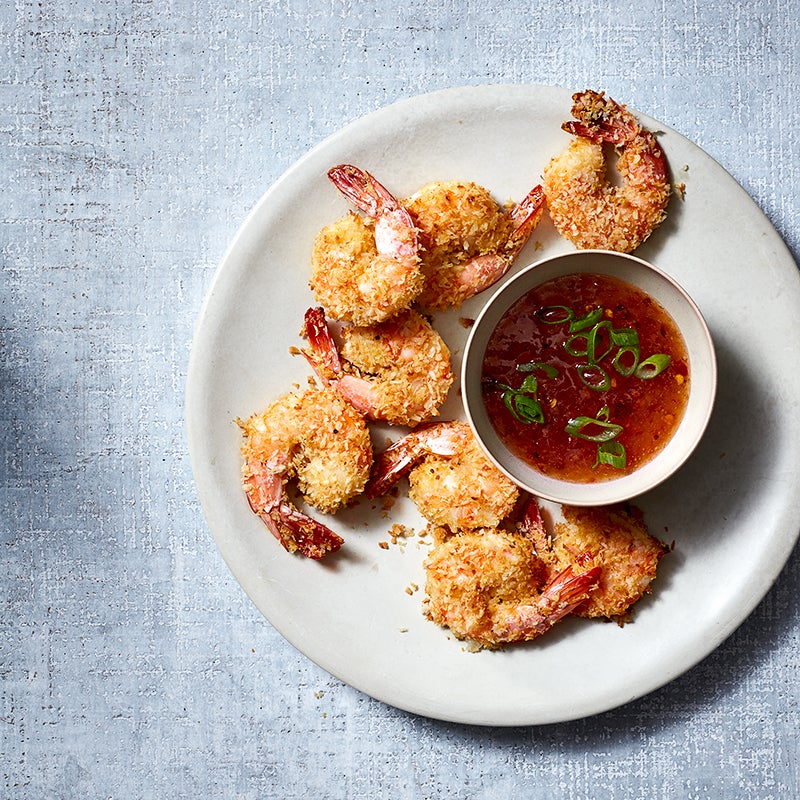 Oven-fried coconut shrimp with orange-chili dipping sauce