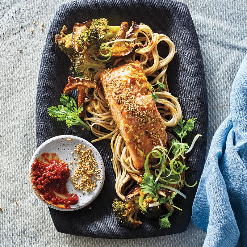 Sesame-Ginger Salmon, Shiitakes & Broccolini with Soba Noodles