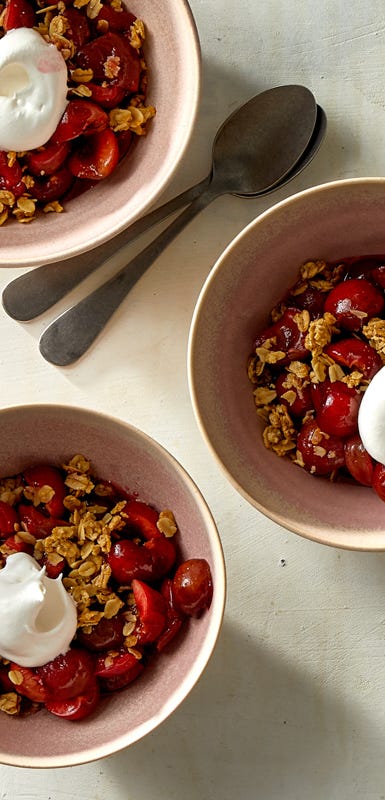 Cherry season is short, so enjoy them while you can! Look for dark red, firm cherries with bright green stems (though stemless cherries can still be fresh and delicious). For an extra-sweet treat, be on the lookout for red-gold Rainier cherries, which hit the market closer to July. Cherries store well for a few days at room temperature. Put them in a dry colander for a little air circulation, and don’t rinse them until you’re ready to use them. If you want them to stick around a few extra days, store them in that colander in the refrigerator. Or turn them into one of the recipes below (the breakfast bread is particularly simple and uses WeightWatchers® apple cinnamon instant oatmeal!)