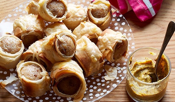 The scrumptious mini pigs in blankets you see here use chicken breakfast sausage in place of hot dogs.