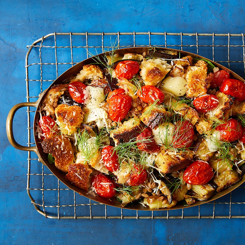 Eggplant, Fennel, Tomato, Farro & Fontina Casserole