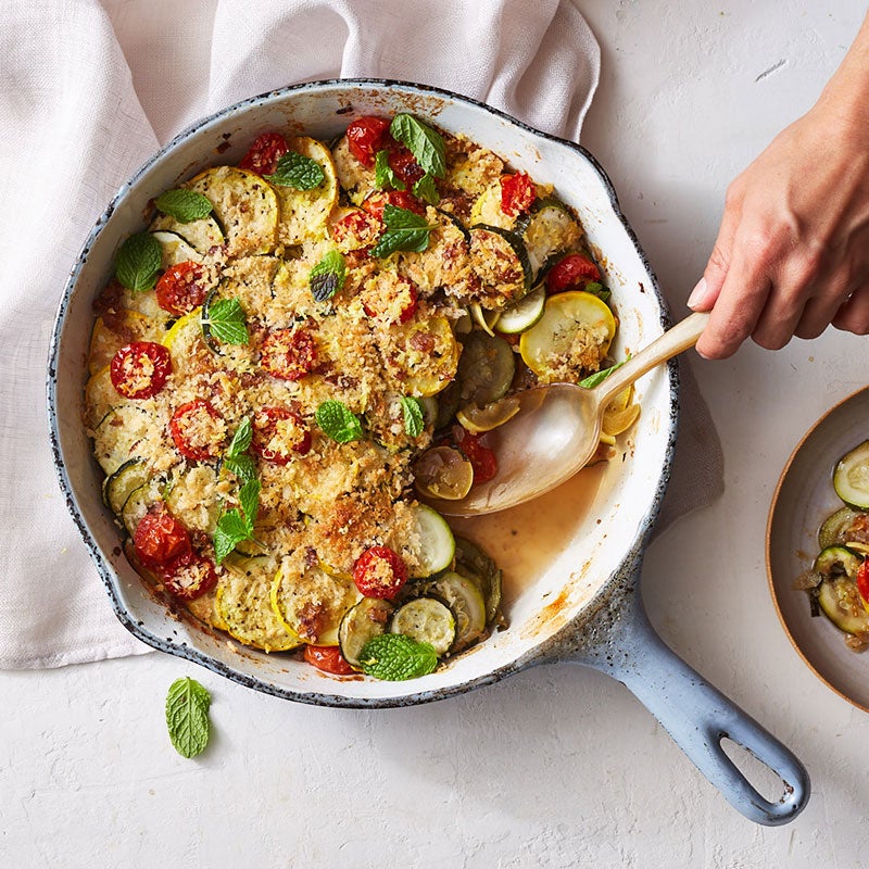 Stir-fry cubed or shredded summer squash with your favorite protein (chicken, pork, shrimp, or beef), thinly sliced scallions, and your favorite stir-fry sauce. But don’t cook them too long. They’ll give off too much moisture and turn the dish soupy.