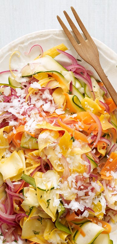 - Use a vegetable peeler to make long, wide noodles from summer squash; serve raw tossed with pesto or peanut sauce.