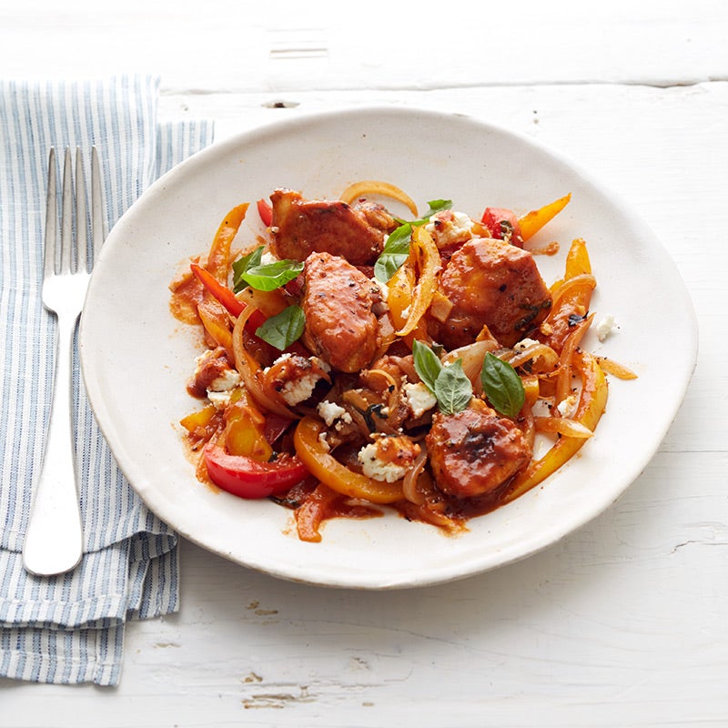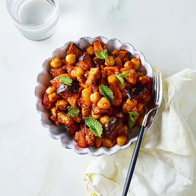 Moroccan chicken tagine with eggplant, peppers, and chickpeas