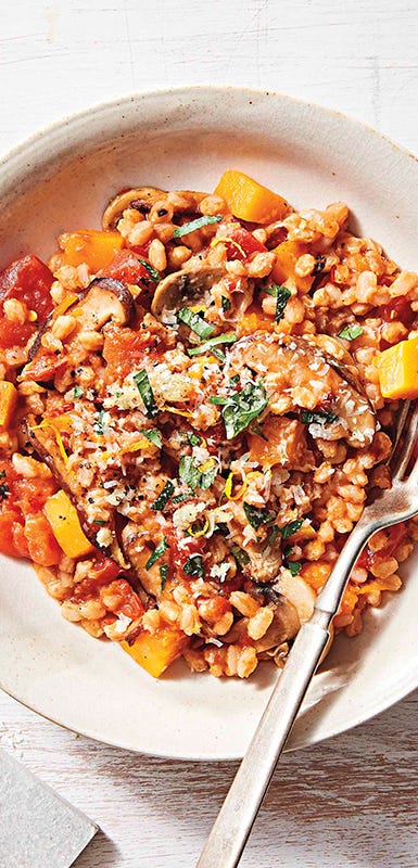 Looking for a vegetarian option? Our farro recipe is both a flavor and texture sensation; the whole grain manages to maintain its pleasant chewiness, while two types of earthy mushrooms, sweet butternut squash, and Parmesan cheese make sure your palate never falls asleep at the table.