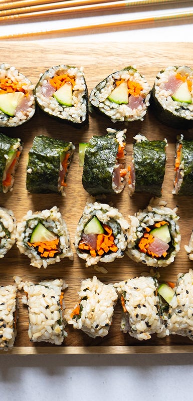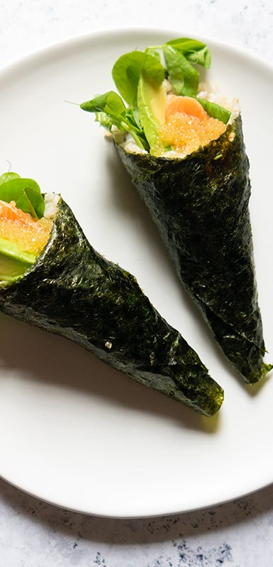 If you're intimidated by the thought of forming sushi maki rolls, give hand rolls a try. They combine all your favorite flavors of sushi, but instead of layering and rolling everything together in a perfect cylinder, you simply wrap them in a cone of seaweed for a more casual presentation.