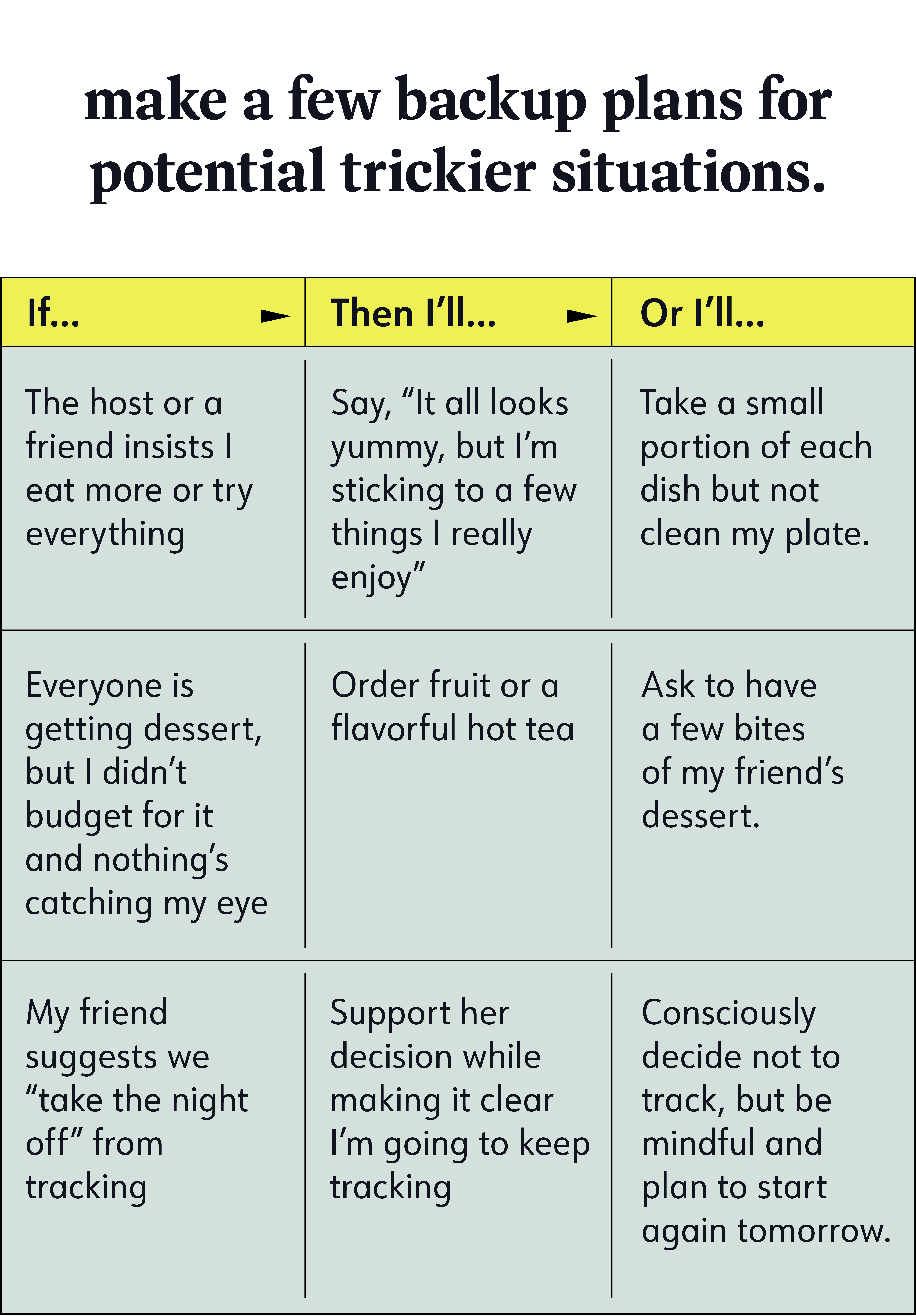 The same is true when you’re eating away from home, like at a restaurant or a friend’s house. Science says planning ahead and having contingencies in place can help you stay on track. “Help” is the key word. You can’t control everything, nor are you perfect—but you deserve to enjoy yourself. Meaning it’s OK if the appetizers are so delicious, you eat more than intended. Same if you tried to avoid the bread basket but it was warm and right there. In those cases, you regroup, make a plan to get back on track, and keep going.