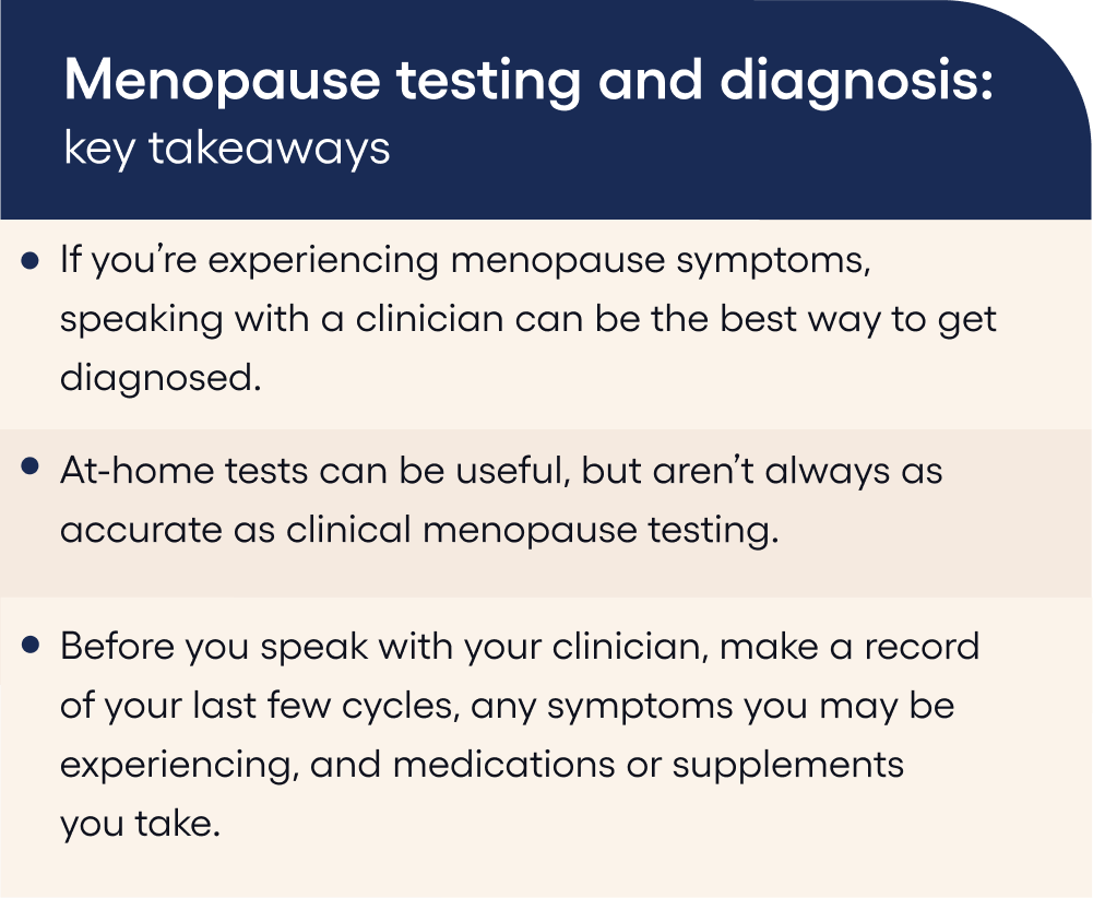 But while it may be tempting to do a test on your own, at-home tests for perimenopause can be inaccurate. Results can fluctuate from test to test and can be skewed by various factors. It’s important to recognize that at-home tests are not a substitute for a professional diagnosis nor are they definitive. If you’re experiencing symptoms that you’re concerned about, heavy bleeding for example, then consulting with a clinician is the best thing you can do. If you do decide to take a home test, bringing the results with you can help with your professional diagnosis.