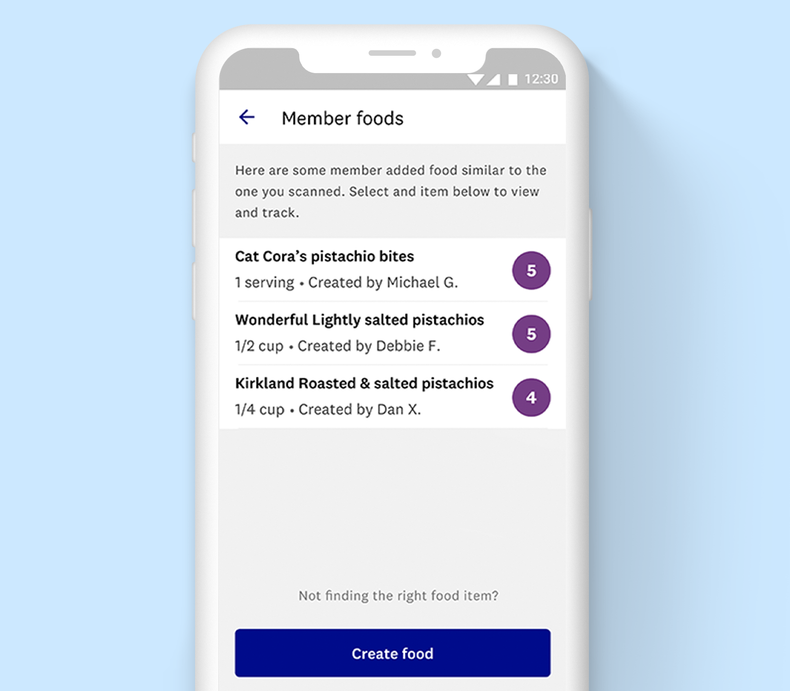 If you scan a barcode and it doesn't exist in our database, a selection of member-added foods similar to the item you scanned will display, which you can then choose to track.