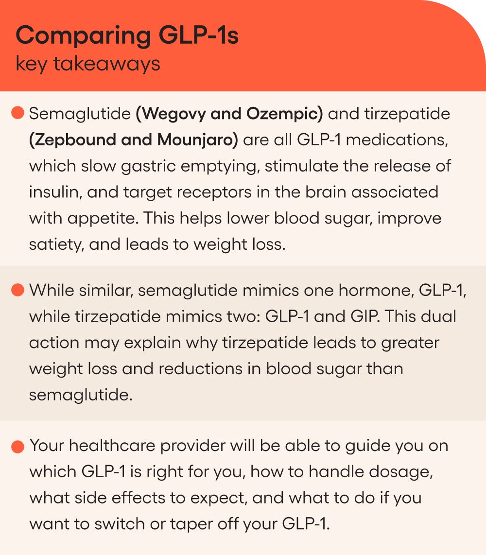 Within the overall category of GLP-1s, you have multiple options, including semaglutide, with the brand names Wegovy and Ozempic, and tirzepatide, with the brand names Mounjaro and Zepbound. What do these medications have in common and how are they different? This guide will compare the different GLP-1 options available to help you understand your choices better.