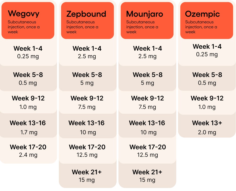 In general, the medications are first prescribed at the lowest dose, gradually increasing the dose over time. See below for a sample tirzepatide vs semaglutide dosage chart: