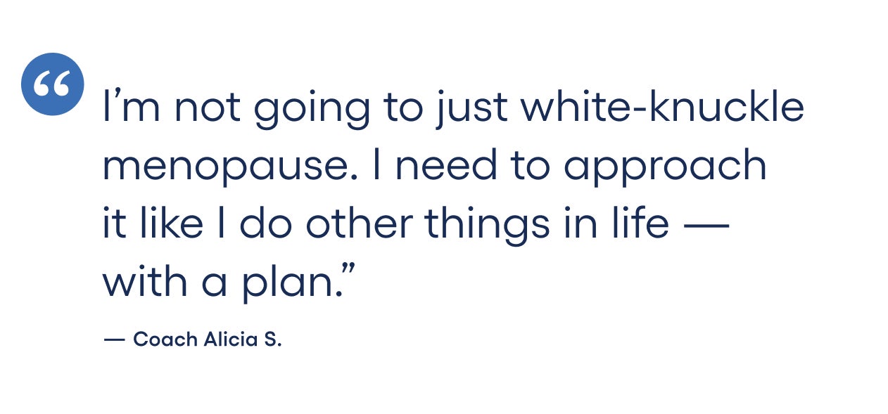 “I used to sleep like a baby, and now I wake up at all times of night and stare at the ceiling. When I don’t get the sleep I need, I snack more. I was thinking to myself that I’m not going to just white-knuckle menopause. I need to approach it like I do other things in life — with a plan. I’m going to do the things that will help me get through this stage of life. For example, I bought a cooling pillow — I’m also going to add another activity day to my week.” –Coach Alicia S.