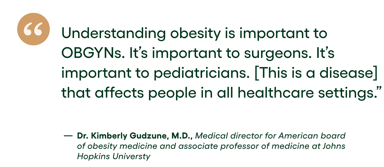 ![quote: Understanding obesity is important to OBGYNs. It's important to surgeons. It's important to pediatricians. [This is a disease] that affects people in all healthcare settings. - DR. KIMBERLY GUDZUNE, M.D. MEDICAL DIRECTOR FOR THE AMERICAN BOARD OF OBESITY MEDICINE AND ASSOCIATE PROFESSOR OF MEDICINE AT JOHNS HOPKINS UNIVERSITY quote: Understanding obesity is important to OBGYNs. It's important to surgeons. It's important to pediatricians. [This is a disease] that affects people in all healthcare settings. - DR. KIMBERLY GUDZUNE, M.D. MEDICAL DIRECTOR FOR THE AMERICAN BOARD OF OBESITY MEDICINE AND ASSOCIATE PROFESSOR OF MEDICINE AT JOHNS HOPKINS UNIVERSITY](https://v.cdn.ww.com/media/system/cms/us/Pullquote_Desktop_2.png)
