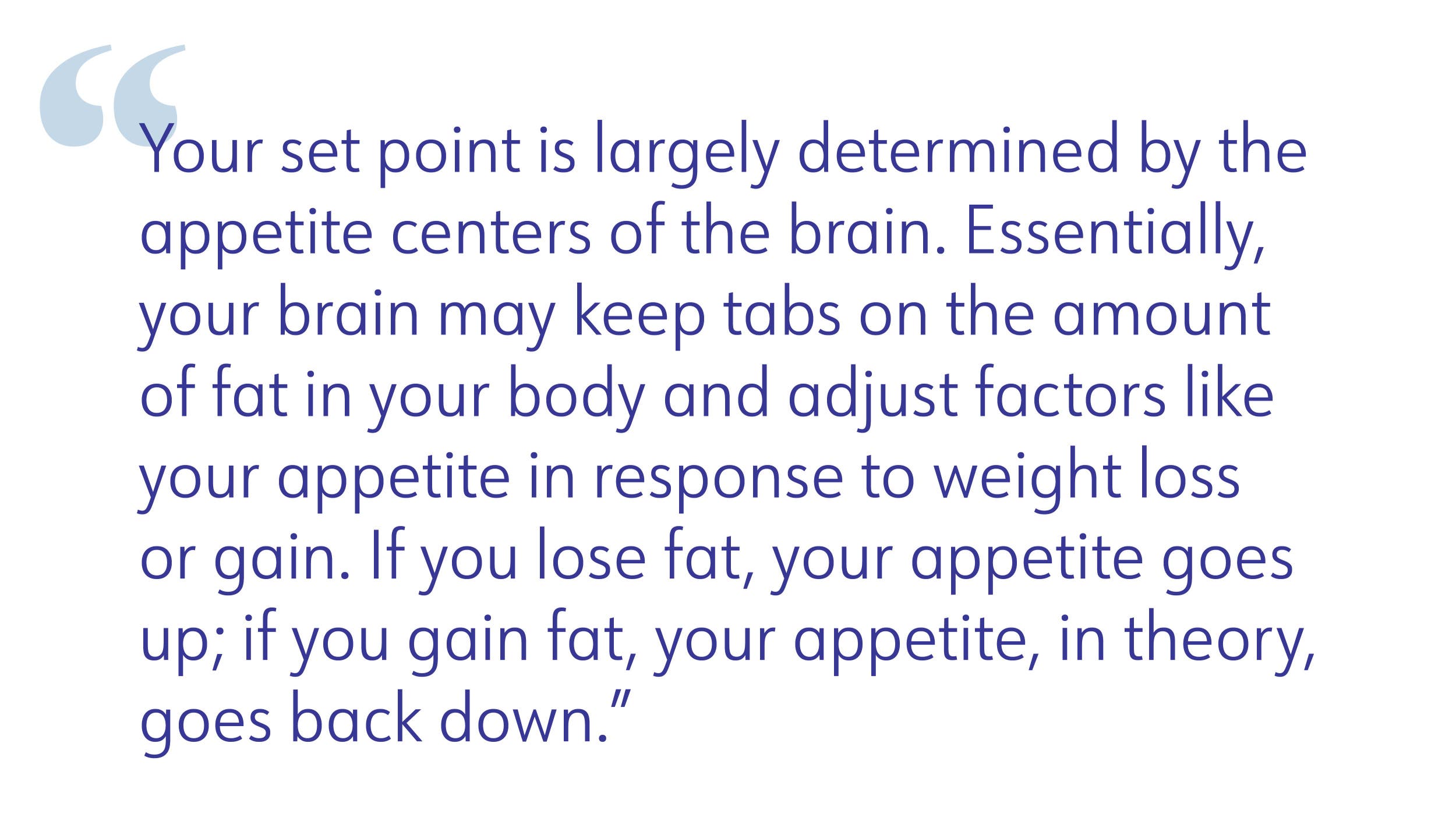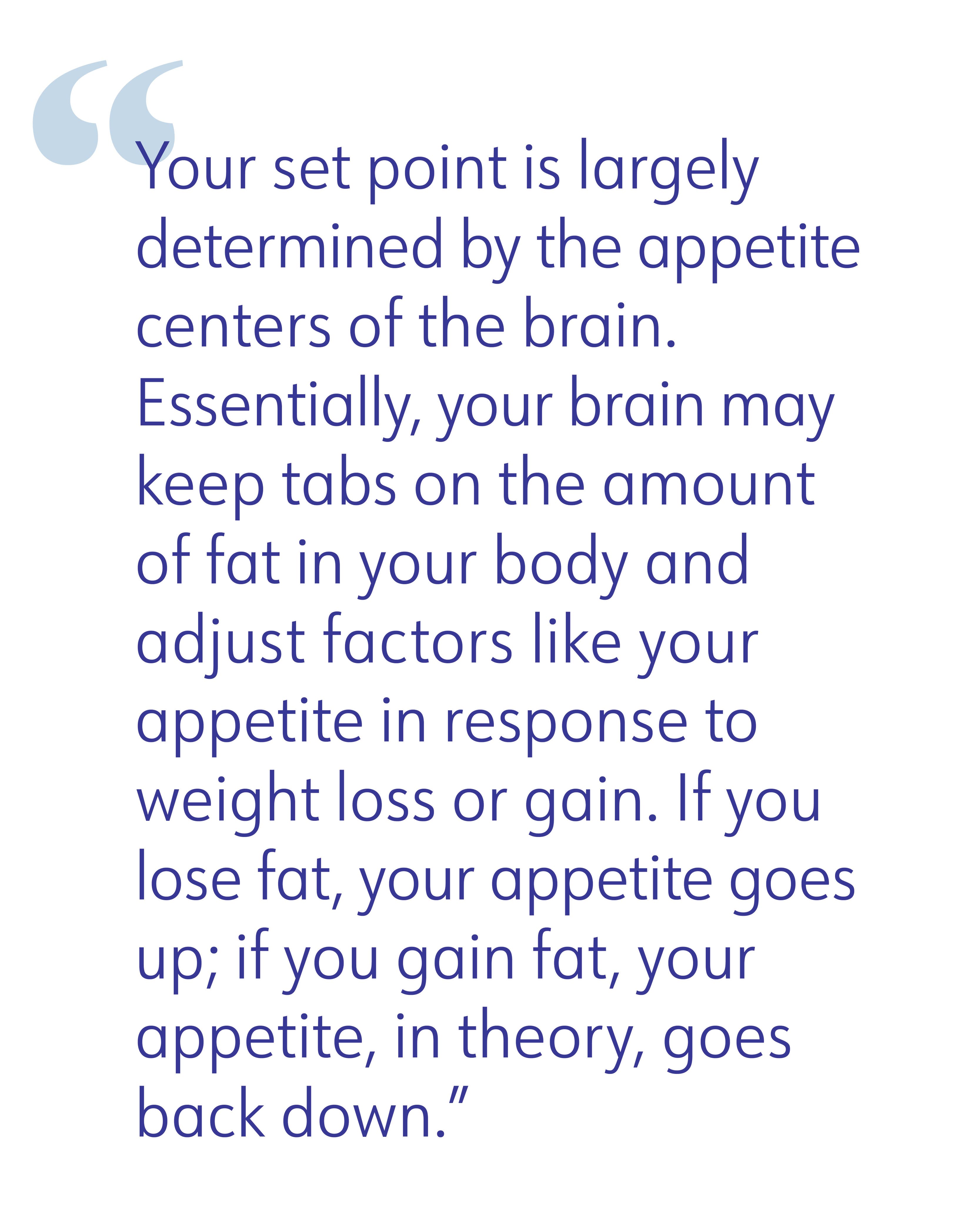 Your brain: Your set point is largely determined by the appetite centers of the brain, says Kushner. Essentially your brain may keep tabs on the amount of fat in your body and adjust factors like your appetite in response to weight loss or gain. If you lose fat, your appetite goes up; if you gain fat, your appetite, in theory, goes back down.