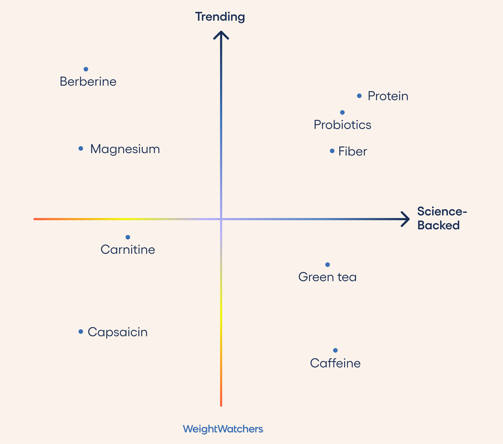 The WeightWatchers science team pored over the research so you don’t have to. “Overall, there’s limited evidence to suggest that supplements are effective for long-term weight loss,” says Kelli Richardson, Ph.D., RDN, the manager for clinical research and nutrition at WeightWatchers. “And they shouldn’t ever be considered a primary weight-loss strategy.” You need nutrition and movement to fill that role. That said, these boosters aren’t all a bust. Check out this handy matrix to understand which supplements have the most science on their side and which are mostly hype at this point.