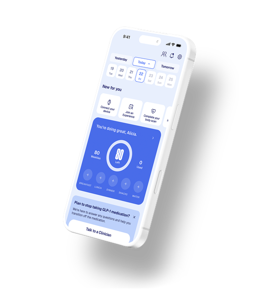 Medication shown not representative of actual product, which is dispensed by a licensed pharmacy. Programs do not include the cost of GLP-1 medications. All medications require eligibility and a prescription. All medical services are provided through our affiliated medical group, WeightWatchers Clinic.