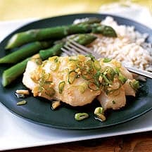 Sea bass—with its silvery blue-green skin, few bones, and lean white flesh—is a much sought-after fish. Here, it's flavored with a savory combination of scallions, soy sauce, ginger, and sesame oil. Serve with rice, or you can score a quick veggie dish while the fish cooks by simply placing the fish packet in a large steamer pot (filled with 1 inch of boiling water) instead of a skillet. Then, during the last five minutes of cooking time, fill the steamer basket with 1 pound of trimmed asparagus or 2 cups of broccoli florets. If you can't find sea bass, feel free to substitute grouper, snapper, cod, or even sea scallops if you like.