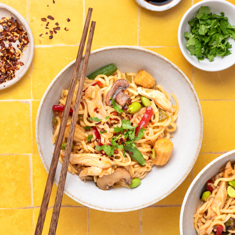 Our colorful noodle bowl uses only five ingredients and comes together in a flash when you have cooked chicken and cooked noodles in your fridge. Choose a frozen stir-fry blend that includes the veggies you love; we like one with sugar snaps, red peppers, mushrooms, baby corn, and carrots.