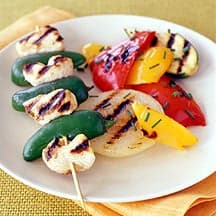 Cook once and eat twice with these easy, grilled chicken skewers. Plan smart to save time during the rest of the week by mixing and matching them with other quick-to-prepare ingredients for distinctly different yet super simple meals. First, serve them over a bed of hot cooked rice or cauli-rice tossed with cilantro and a squeeze of lime. Later in the week, reheat them and quickly assemble them over a bed of mixed greens tossed with black beans and a lime or lemon vinaigrette. To store between meals, remove the chicken and vegetables from their skewers and keep them in the refrigerator for up to 3 days.