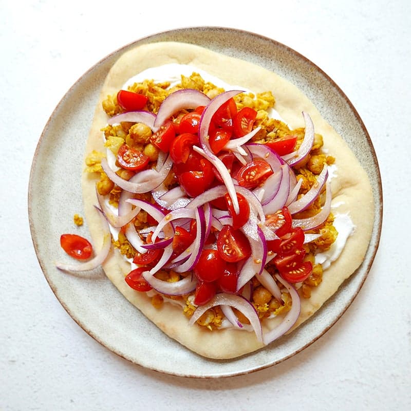 This hearty, protein-rich dish comes together in a flash and works beautifully as a convenient cook-once, eat-twice dinner/lunch combo. Simply store the components separately, and reheat the chickpeas and assemble the flatbread before enjoying the leftovers. We like to enjoy this like a sandwich wrap, but you could also crisp the naan in the oven, add the toppings, and eat it pizza-style.