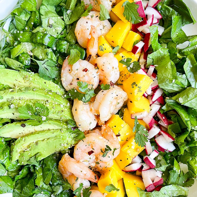Divide the lettuce between two serving bowls. Top with the avocado, mango, radishes, and cilantro. Add the shrimp, spooning any sauce from the skillet on top. Drizzle with the vinaigrette and season with the Curry Salt, to taste.