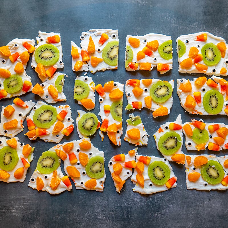 This easy sweet snack balances fresh, colorful fruit and fun Halloween candy with lightly sweetened yogurt. It’s a great make-ahead option for a Halloween gathering; you can prepare it a few days in advance and store it in the freezer until you’re ready to serve it. It’s tricky to cut when it’s frozen hard, so let it sit out at room temperature for a few minutes. If you end up with uneven pieces, know that the smaller ones are easier for little kids to manage.