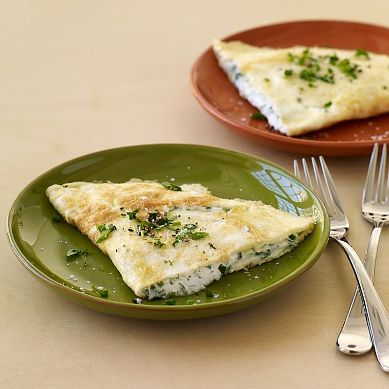 When your herb garden’s in full bloom, here’s a go-to, savory breakfast you'll want to make every morning before a busy day. Nothing dresses up a plain omelet like creamy goat cheese and a bunch of fresh herbs. And any herb will do in this recipe; swap tarragon for basil or cilantro for parsley. Feel free to use whatever you have an abundance of. Just keep in mind that if you use either thyme or oregano as part of your herbal mix, use only 1 to 1 1/2 teaspoons, as these herbs impart a strong flavor. Top your omelet with more fresh herbs for an even prettier presentation.