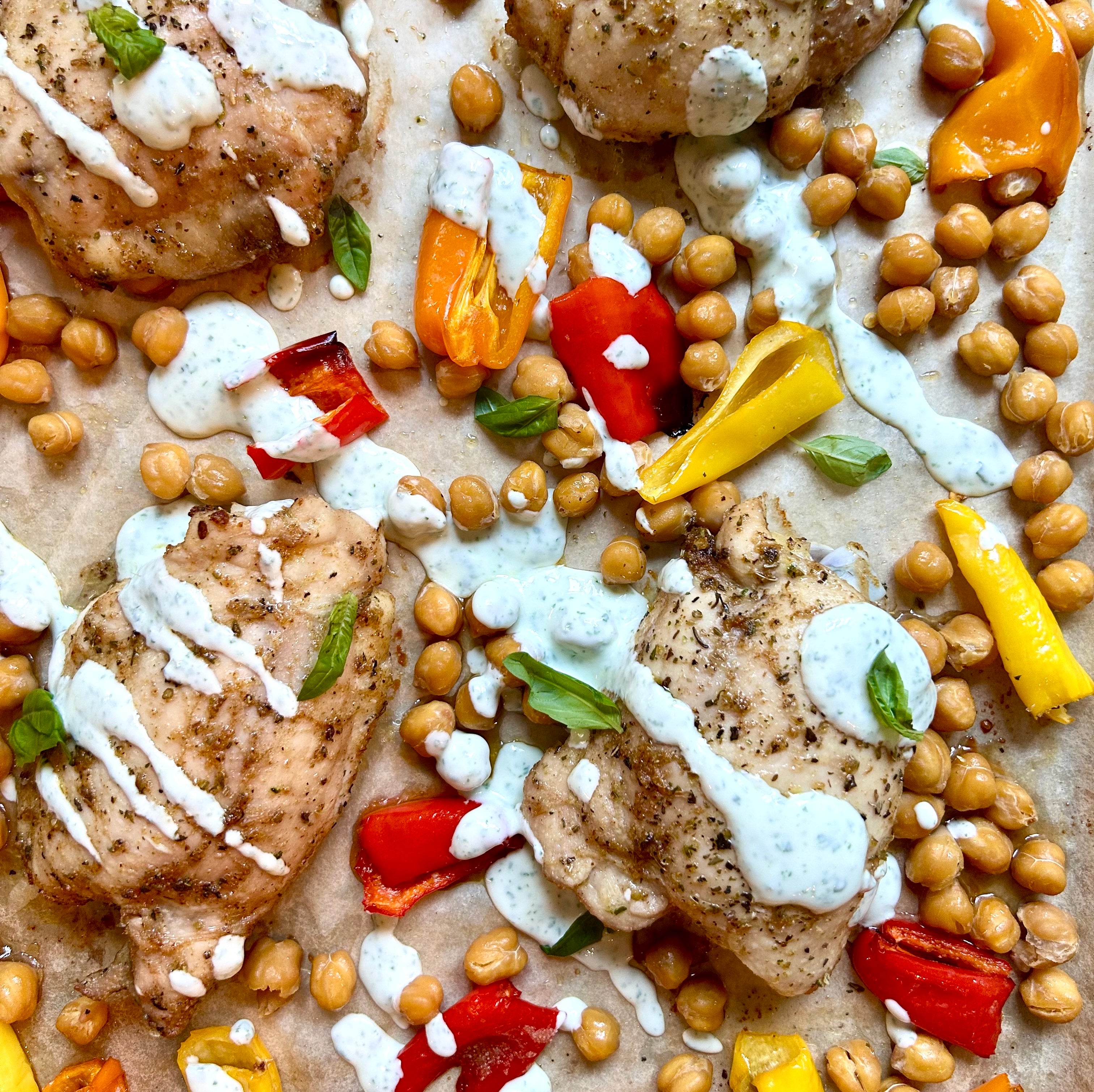 To serve, drizzle the yogurt sauce over the chicken and vegetables.